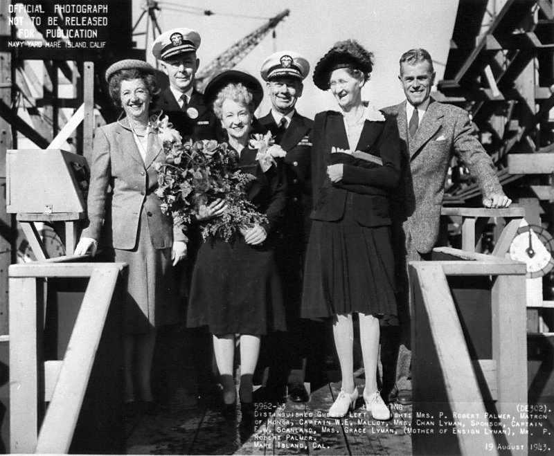 W. E. Malloy (Yard Planning Officer), Mrs. Chan Lyman (Sponsor), Capt. F. W. Scanland, Mrs. Grace Lyman (mother of Ensign Lyman) and Mr. P. Robert Palmer. (U.S. Navy photo #DE-302-5962-43) | ||