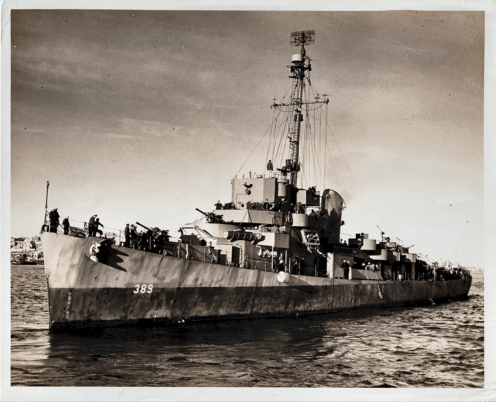 514k | Undated wartime image. Rear of photo reads... from: Public Relations Division, U.S. Coast Guard, Washington, D.C. - Official Coast Guard Photo - A HARD-HITTER--THE DESTROYER ESCORT "A Coast Guard-manned destroyer escort rests in an American harbor after a convoy passage across the Atlantic. These hard- hitting DE's guard vital supplies and reinforcements running in merchantmen and transports over the perilous and stormy sea." |