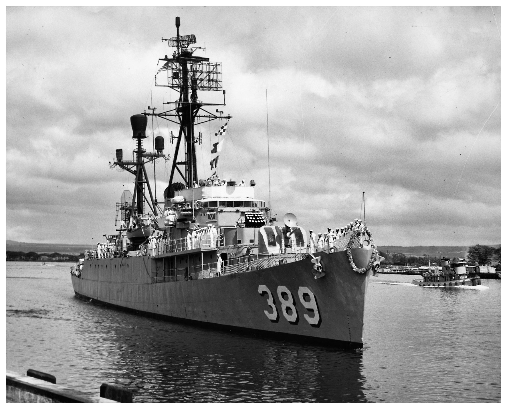 408k | 20 March 1963: Pearl Harbor, Hi. - A lei is presented to USS Durant (DER 389), returning to Pearl Harbor, Hawaii, from Operation Deep Freeze. (U.S. Naval Historical Center Naval Subjects Catalog #L45-80.03.01 from the Naval History and Heritage Command) |