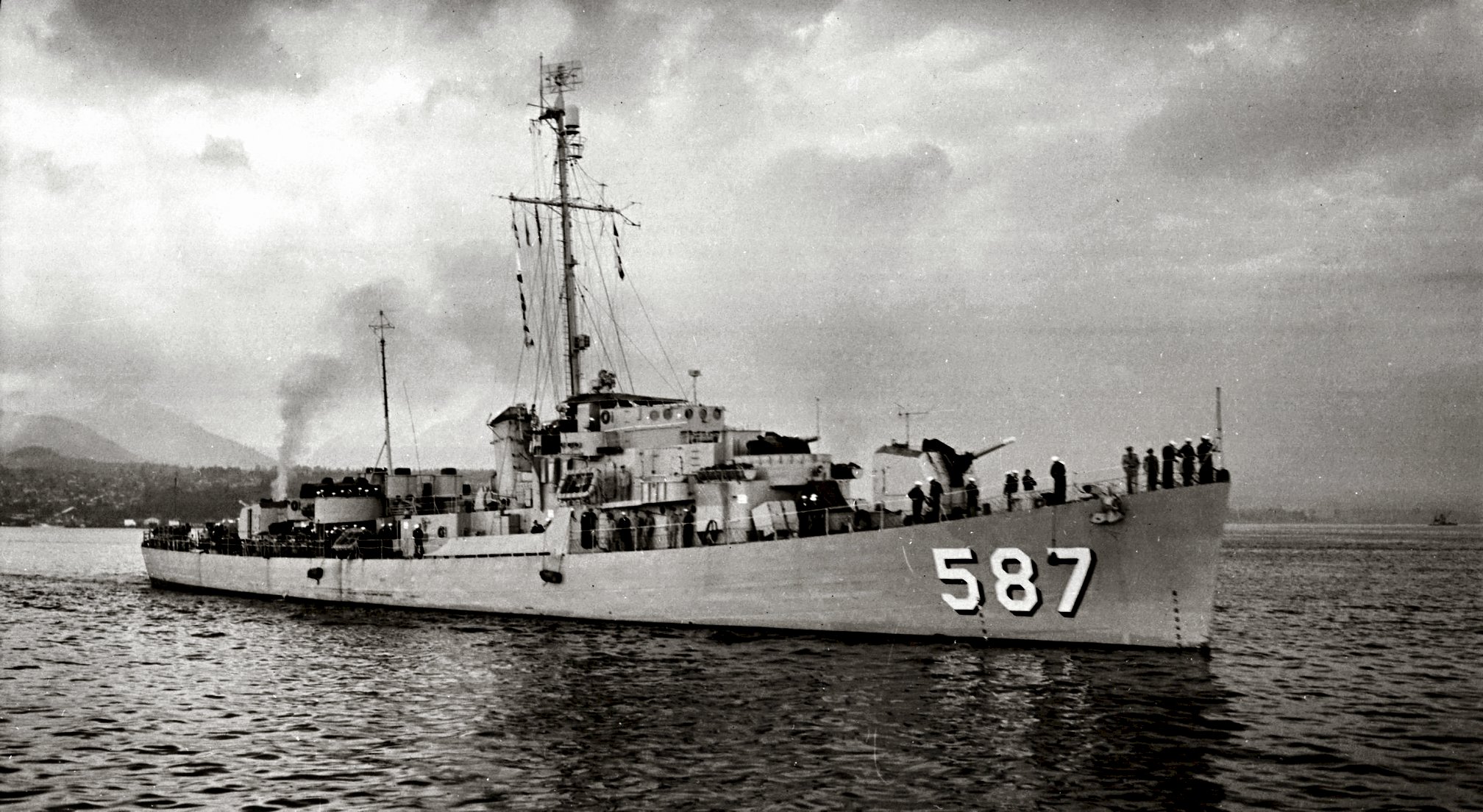 449k | 27 July 1955: Vancouver, British Columbia, Canada - USS Thomas F. Nickel (DE 587) lies off while preparing to moor at Vancouver. (Photo #AM1506-S3-3-: CVA 447-8445 by Walter E. Frost from the City of Vancouver Archives) |