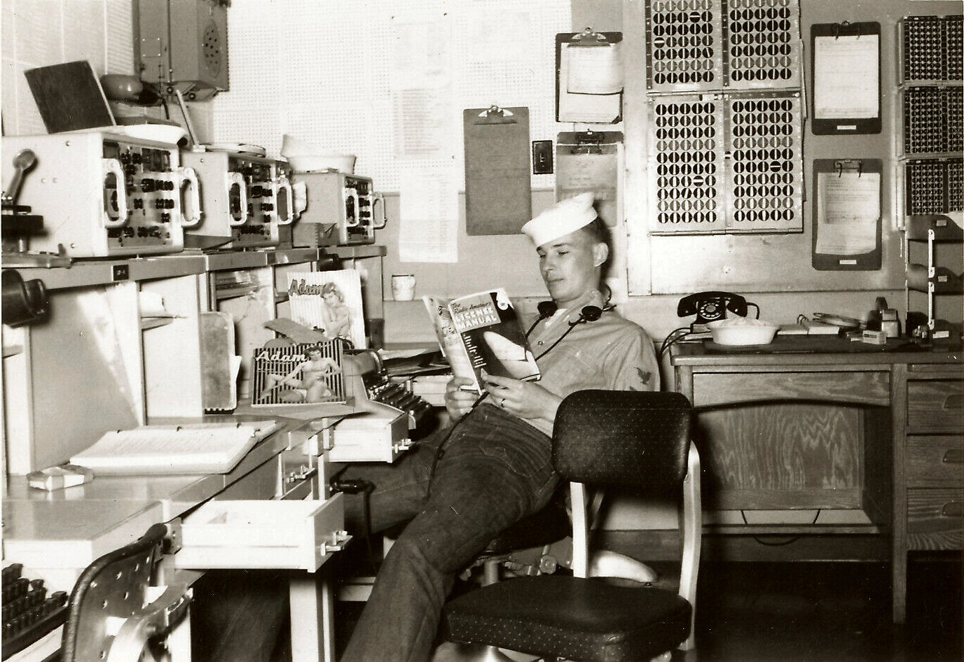 293k | 1950's: A radioman deep in thought aboard USS Thomas F. Nickel (DE 587). This photo was captioned "U.S. Navy sailor, a radioman, reading girly magazines." But