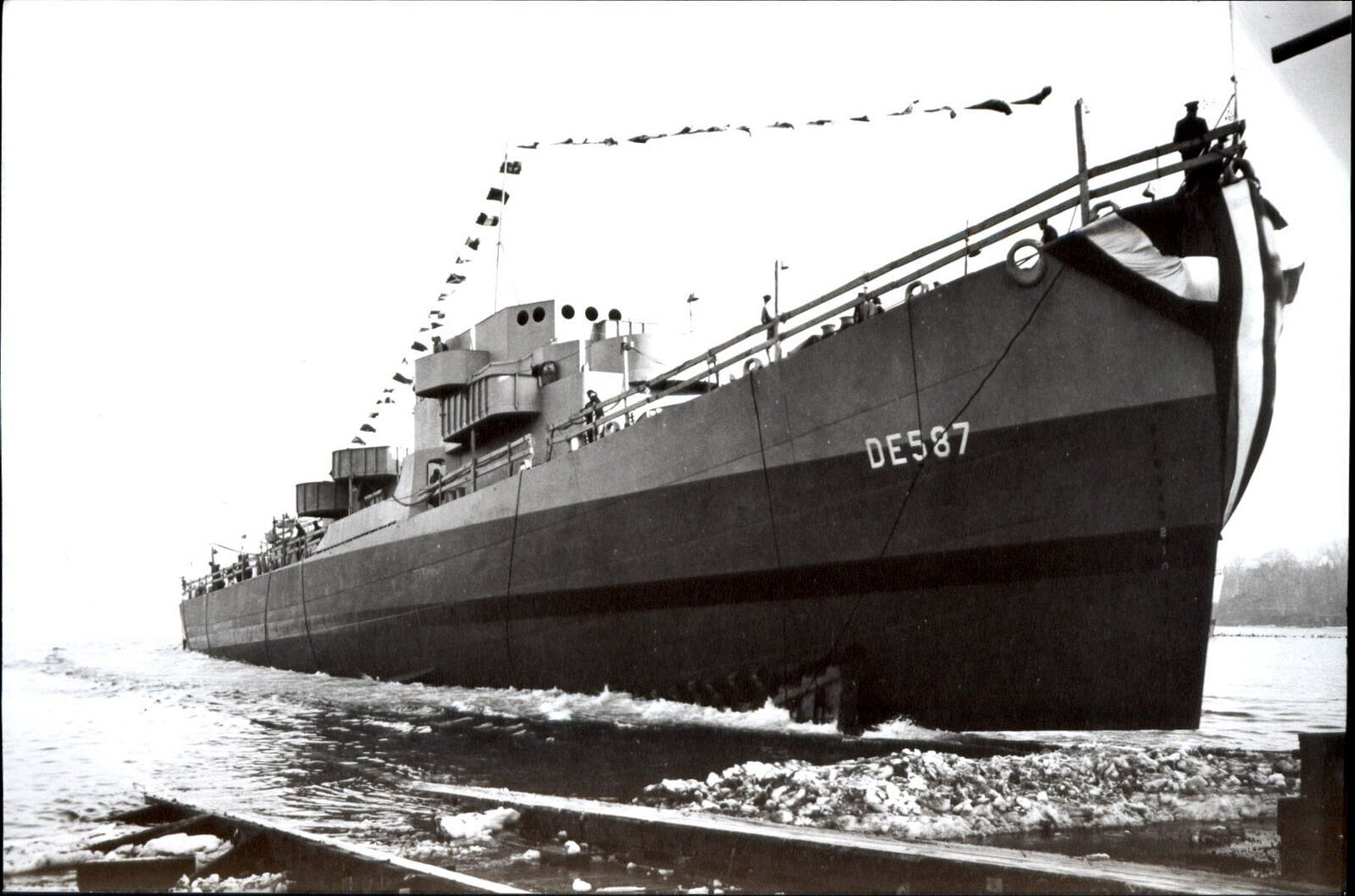 219k | 22 January 1944: Hingham, Mass. - The future USS Thomas F. Nickel (DE 587) slides down the building way ramp into the water. | - | |