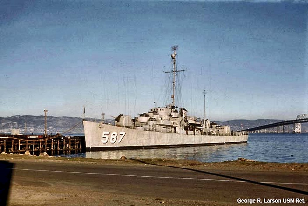116k | mid-1950's: San Francisco, Cal. - USS Thomas F. Nickel (DE 587) moored at the Treasure Island Naval Station. [Photo by George R. Larson; USN (ret.) from the Old Blue Jacket web site of Warren Willis, CWO4, USN (ret.)] |
