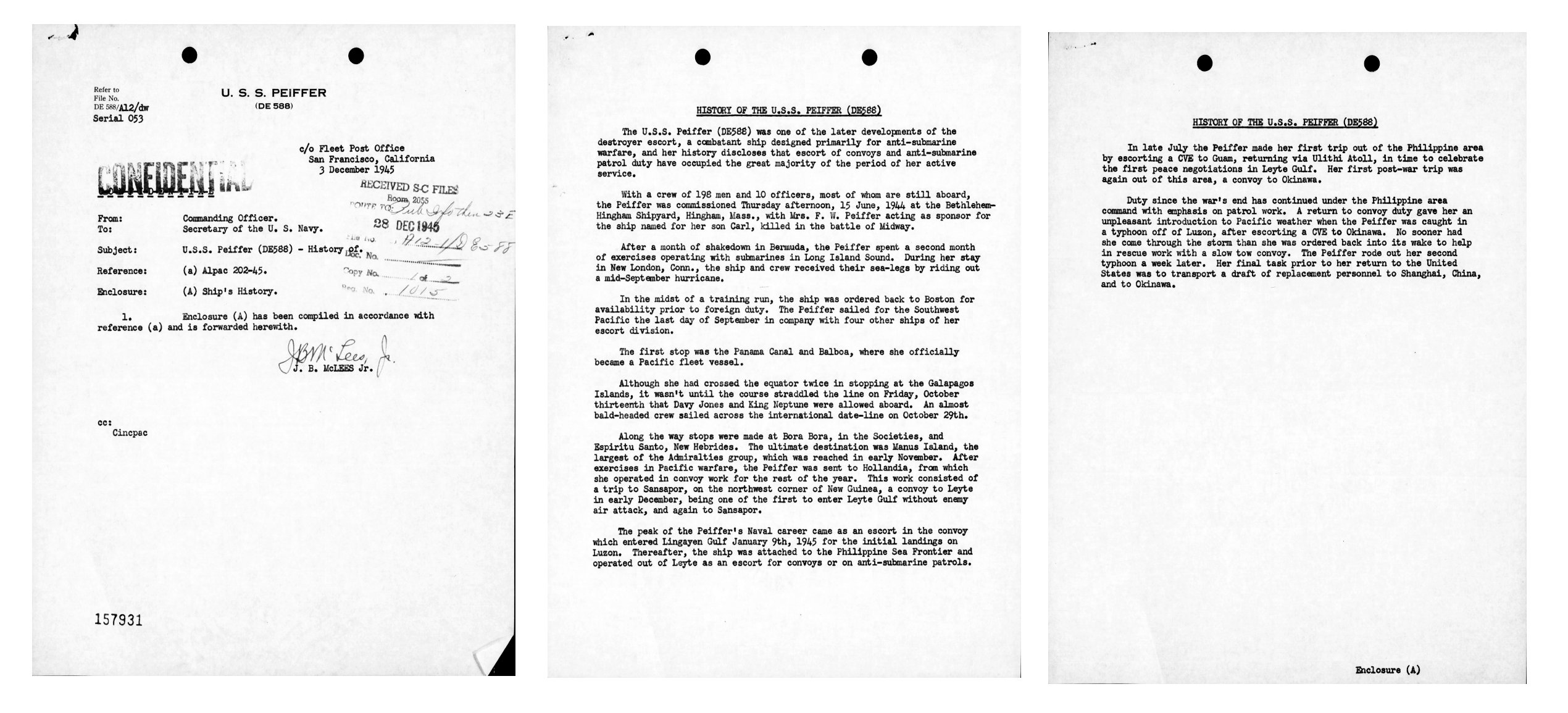 | View the USS Peiffer (DE 588) DANFS history entry located on the Naval History and Heritage Command web site. |