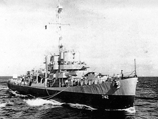 most of the month. She is wearing camouflage 31/10D. The vertical colors are dull black and ocean gray. (U.S. Navy Bureau of Ships photo #19-LCM-DE742-1, courtesy of C. Lee Johnson at USN Dazzle, from the National Archives and Records Administration, College Park, Md.) |