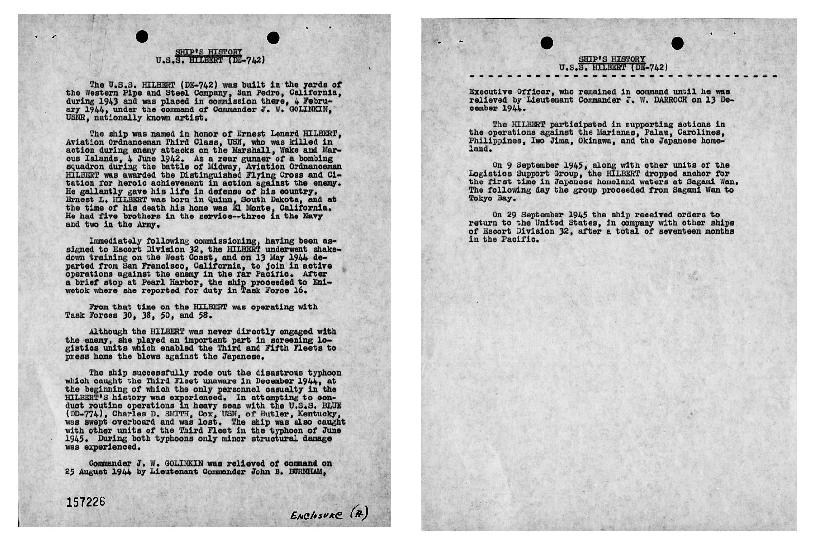 | View the USS Hilbert (DE 742) DANFS history entry located on the Naval History and Heritage Command web site. |