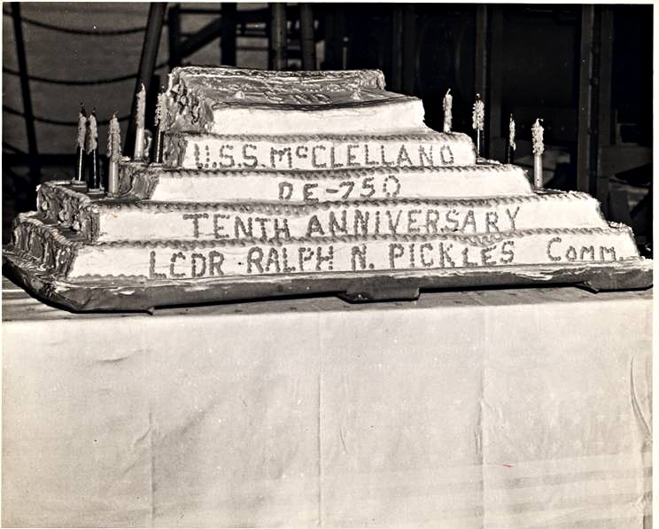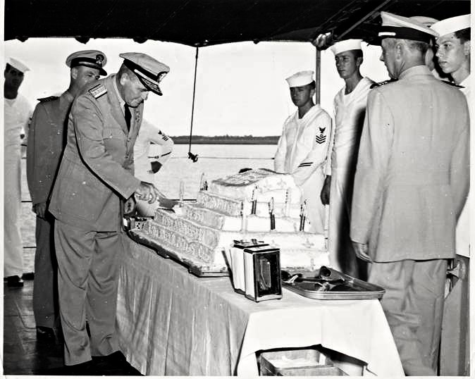 cake as commanding officer Lcdr. Ralph N. Pickles and crewmembers look on. (Photos donated by Anna Hall. The photos were taken by Anna’s dad, Pearl Harbor survivor William Blackstock, Signalman 2nd Class. Bill served in McClelland, USS Laffey (DD 724) and Tidewater (AD 31). |