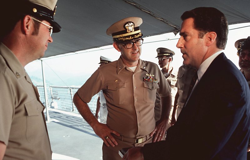 67k | 03 February 1982: Subic Bay, P.I. - Assistant Secretary of the Navy John S. Herrington (right) talks to Cdr John R. Ruff, commanding officer, during a