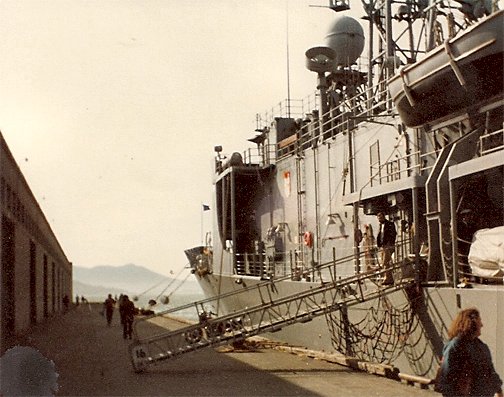 57k | 1981: This photo was taken while on a visit to San Francisco. Here you can see the Command Master Chief (BMCM Meyer) departing the ship. | Craig Nelson Plankowner Former Operation Specialist | |