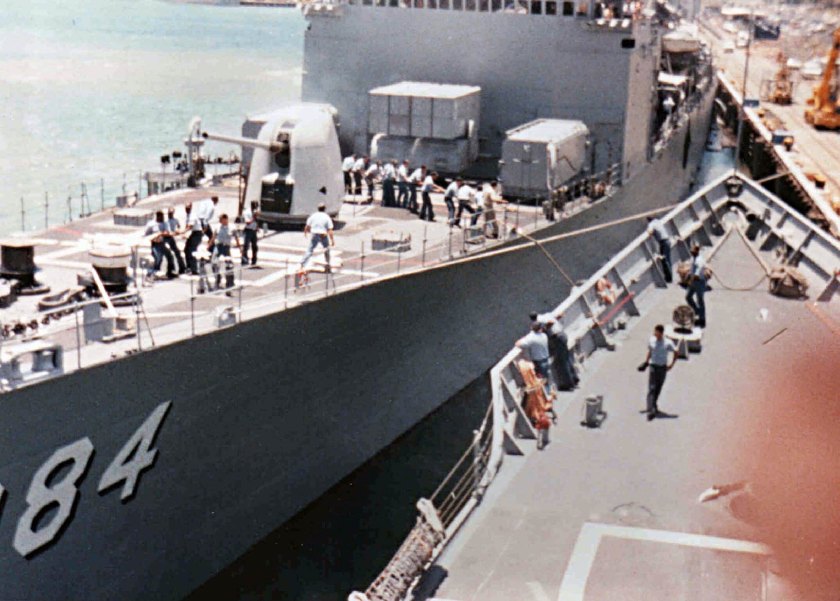 296k | 07 June 1991: Pearl Harbor, Hi. - Wadsworth suffers a near collision when USS Leftwich (DD 984) broke her port shaft clutch and went into an uncommanded forward movement while docking ahead of us. We had arrived after transit from San Diego in the company of USS Gridley (CG 21) and USS Cowpens (CG 63). | Nathan Stewart | |