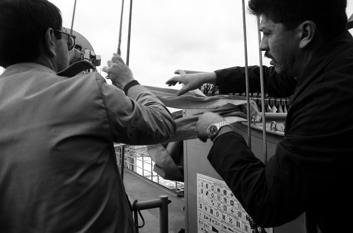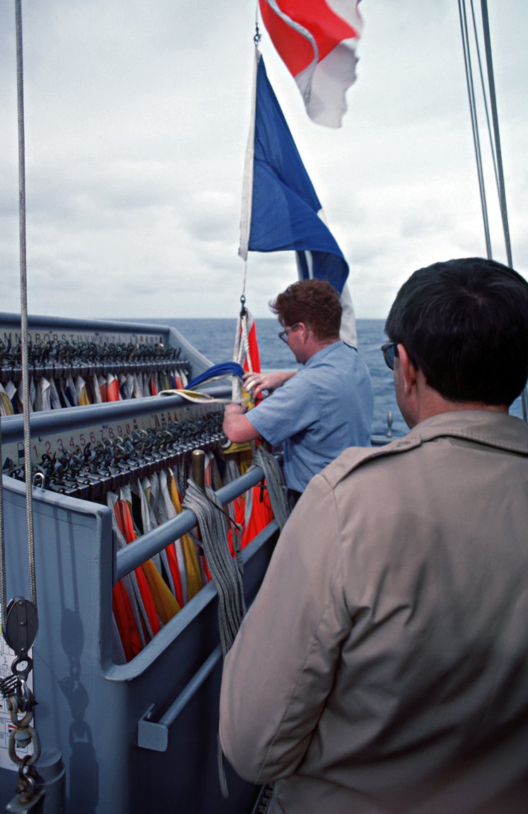 124k | 01 March 1987: The Pacific Ocean - Signalmen prepare to hoist signal pennants aboard Sides. (U.S. Navy photo DVID #DN-SN-88-01566, ARC ID #6430576 by JOC Rich Beth from the National Archives) | ||
