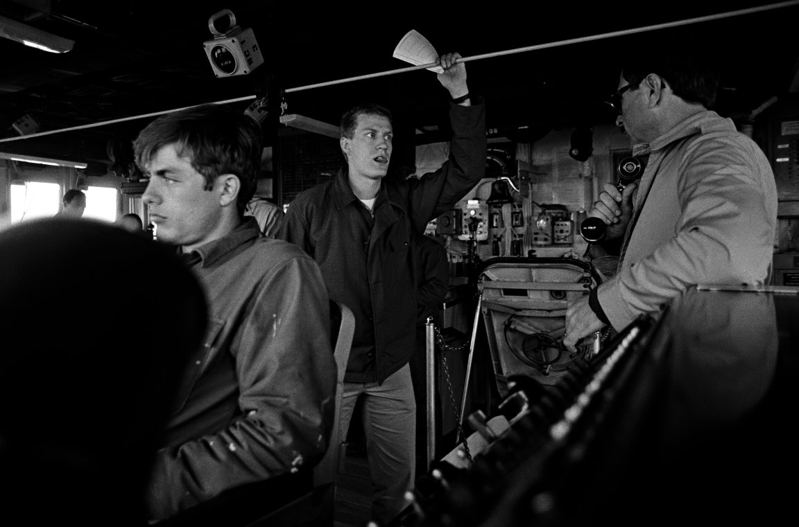 160k | 01 March 1987: The Pacific Ocean - Crew members stand by at their stations on the bridge of the guided missile frigate Sides.