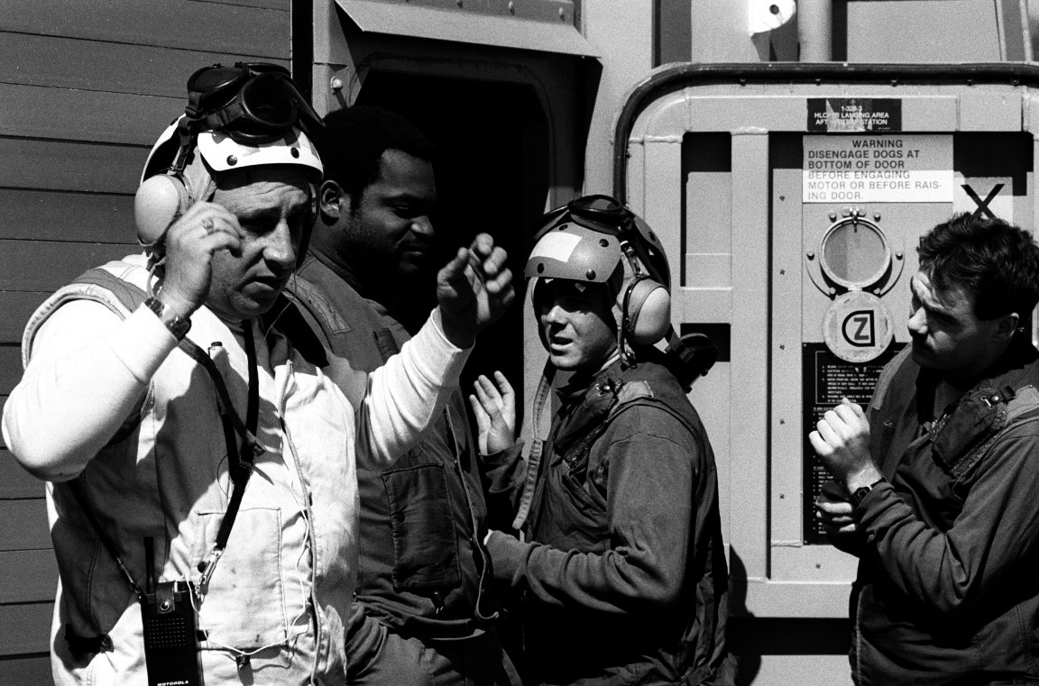 195k | 01 March 1987: The Pacific Ocean - Crew members dressed in flight deck gear take a break aboard the guided missile frigate Sides. (U.S. Navy photo DVID #DN-SN-88-01569, ARC ID #6430579 by JOC Rich Beth from the National Archives) | ||