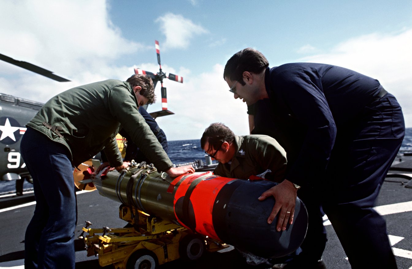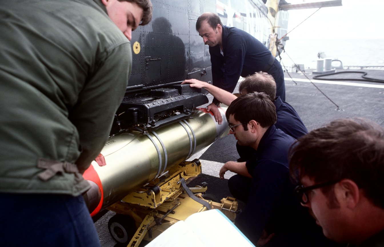 157k | 01 March 1987: The Pacific Ocean - Ordnancemen load a Mark 46 lightweight torpedo onto an SH-2F Sea Sprite helicopter of Helicopter Light Anti-submarine