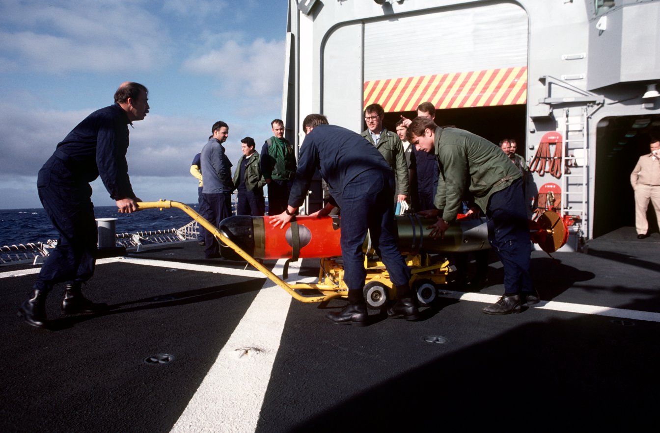187k | 01 March 1987: The Pacific Ocean - Ordnancemen wheel a Mark 46 lightweight torpedo onto the helicopter pad of Sides. The torpedo will be
