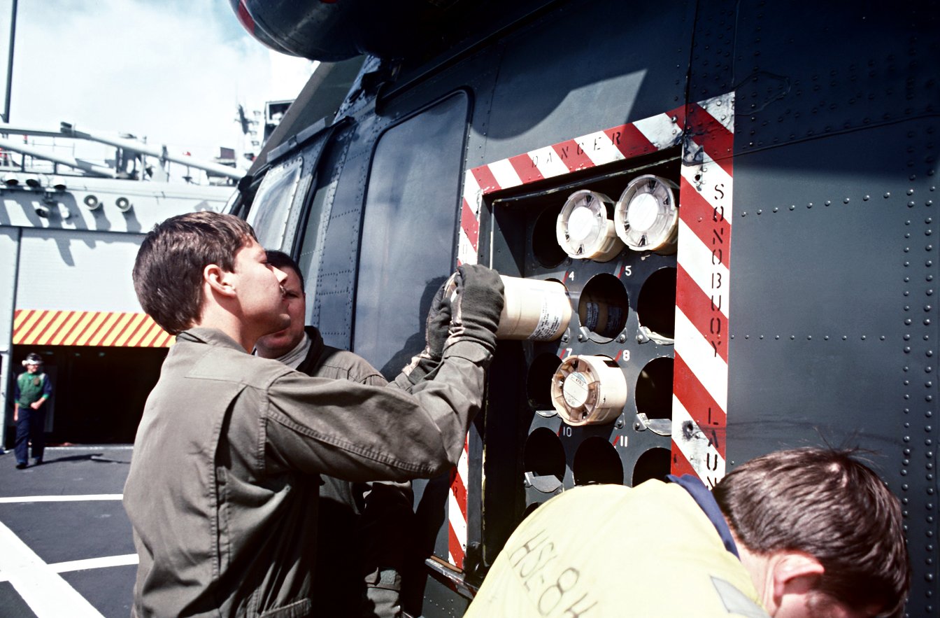 200k | 01 March 1987: The Pacific Ocean - Crew members load sonobouys onto an SH-2F Sea Sprite helicopter from Helicopter Light Anti-submarine Squadron 84