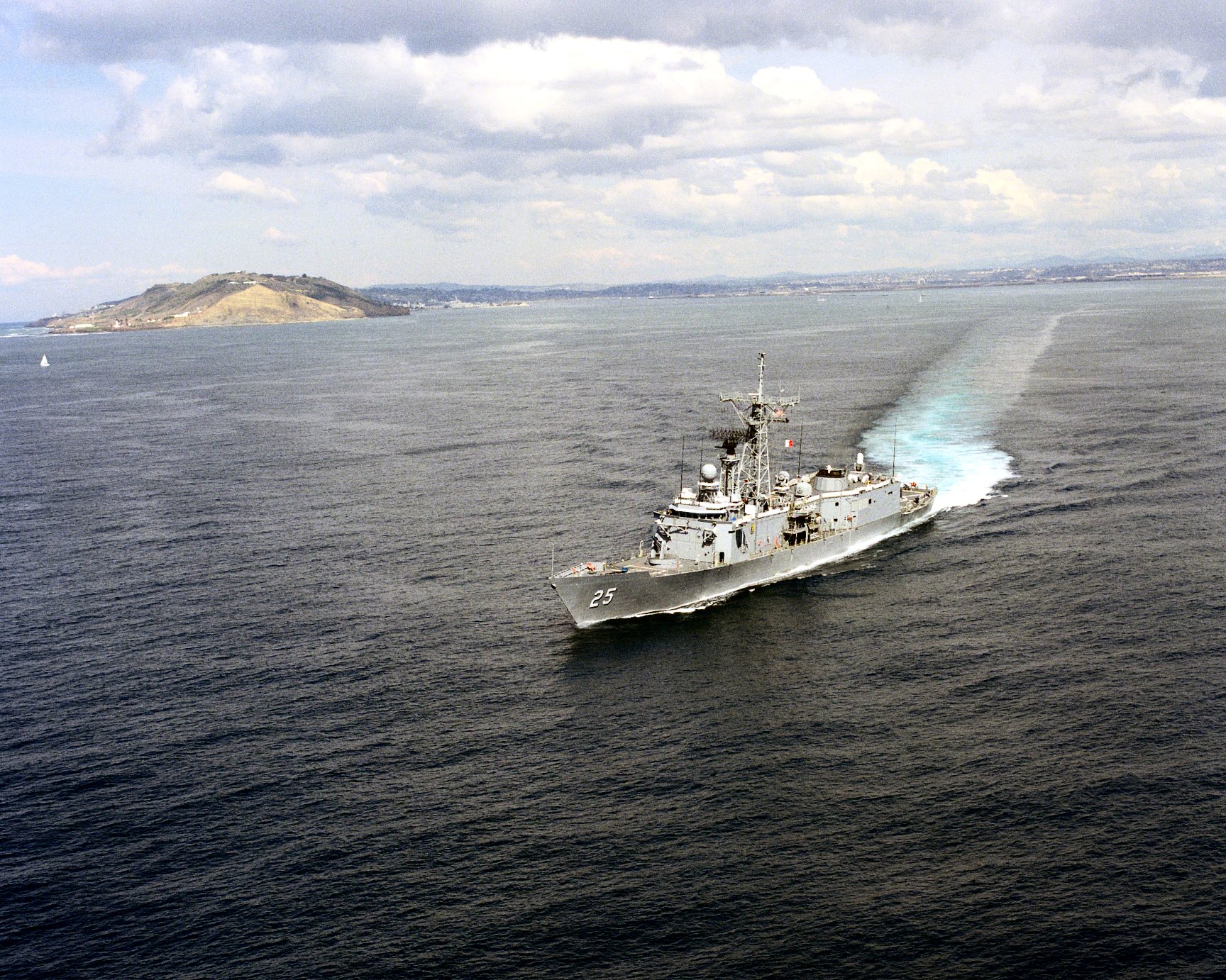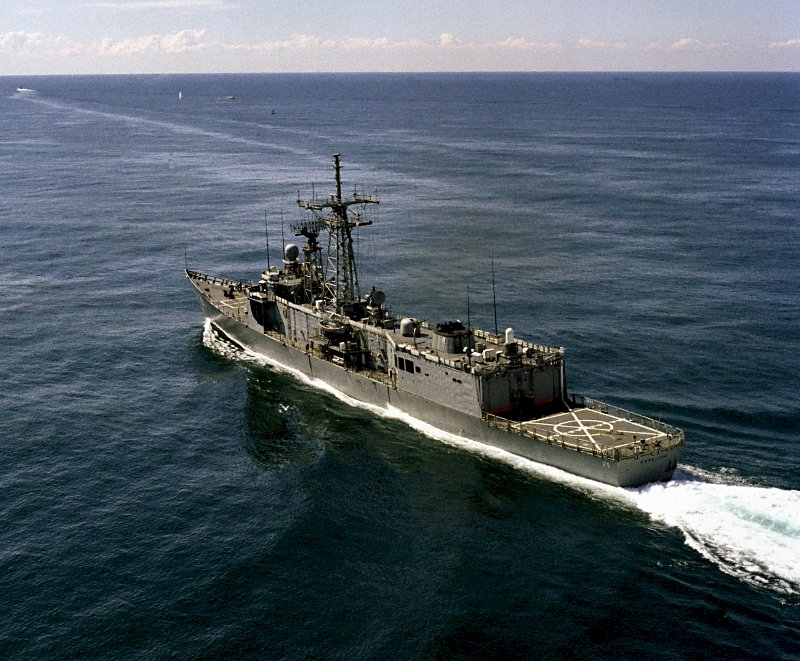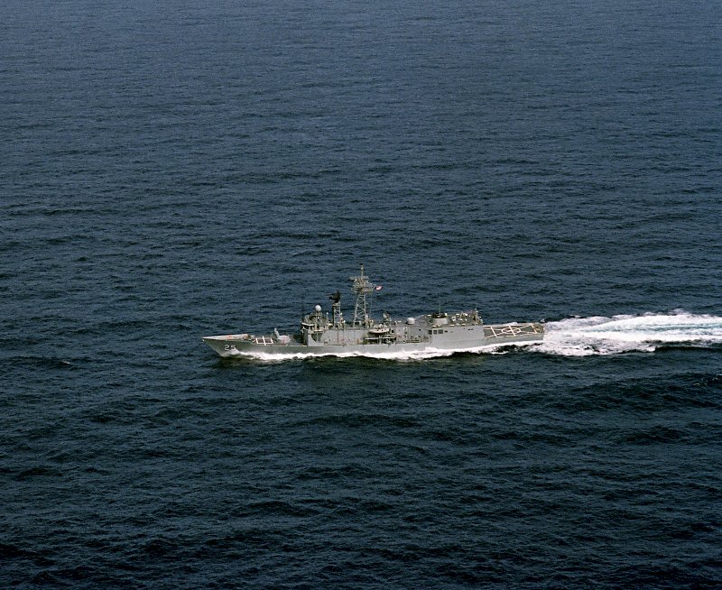 152k | 18 May 1982: at sea - An aerial starboard beam view of the frigate USS Copeland (FFG 25) underway during sea trials. (U.S. Navy photo DVID #DN-SC-83-11949 by Todd Pacific Shipyards, from the Defense Visual Information Center) |