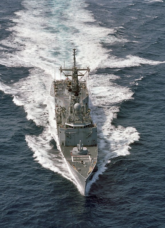550k | 18 May 1982: the Pacific Ocean - Aerial bow view of the guided missile frigate Copeland underway during sea trials. (U.S. Navy Photo, Local ID #330-CFD-DN-SC-83-11947, NAID #6369742 by Todd Pacific Shipyards Corp. from the United States National Archives) |