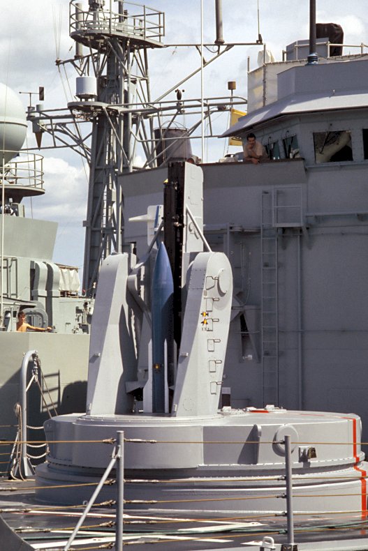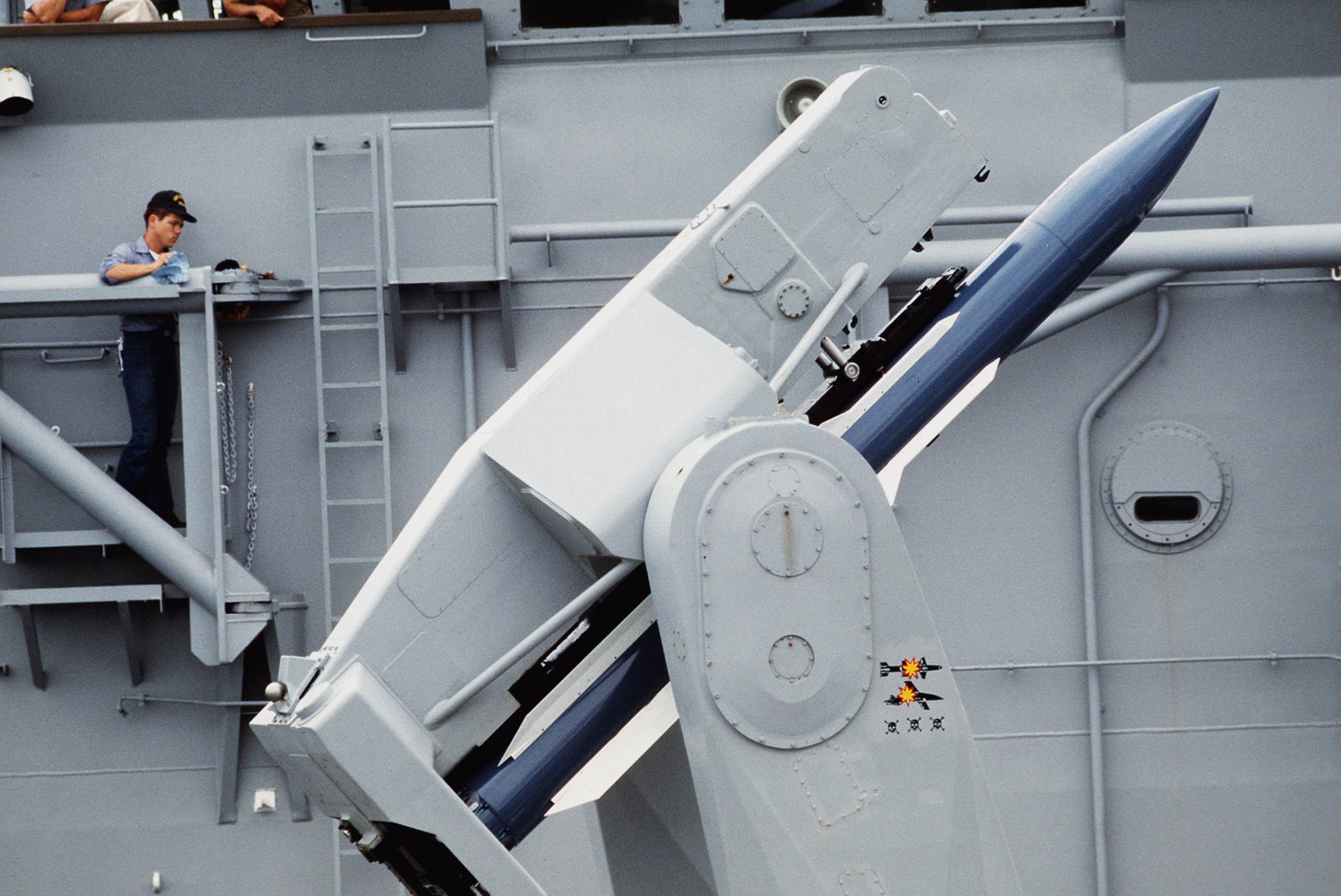 267k | 22 April 1984: A view of a Standard-2 (SM-2) medium range missile loaded onto a Mark 13 launcher aboard Copeland, as the ship operates as part of the