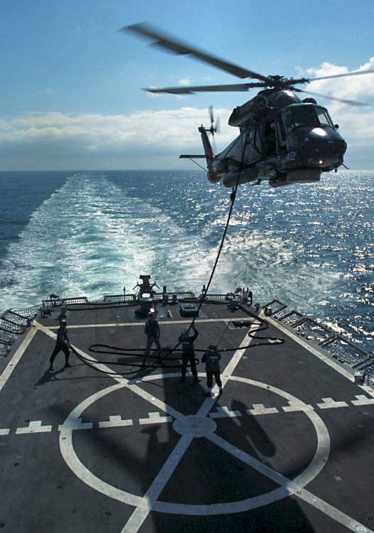 86k | 18 September 1990: at sea - Sailors onboard Copeland perform a ship-to-air refueling operation with a USN SH-60B Seahawk, from a Helicopter Anti-Submarine
