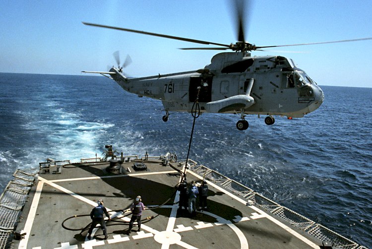 102k | 18 September 1990: at sea - Sailors onboard Copeland perform a ship to air refueling operation with a USN SH-3G Sea King, Helicopter Combat Support