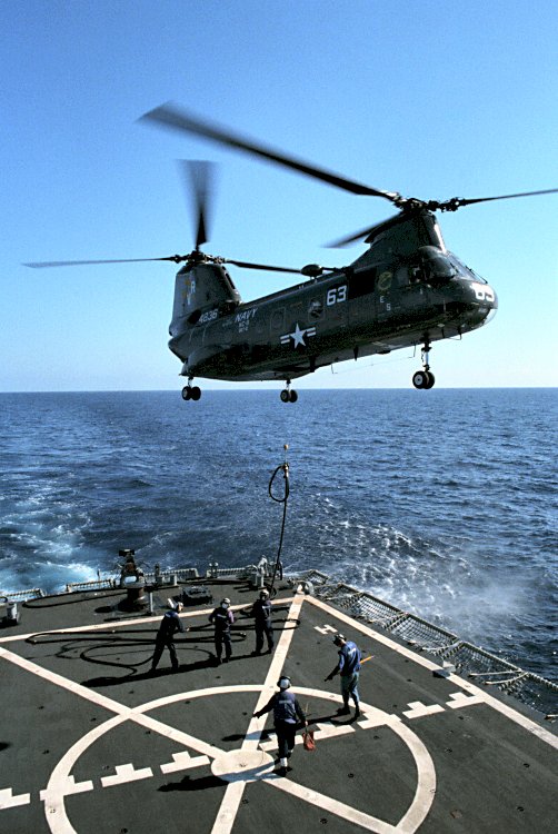 93k | 18 September 1990: at sea - Sailors onboard Copeland perform a ship to air refueling operation with a USN H-46 Seaknight, Helicopter Combat Support