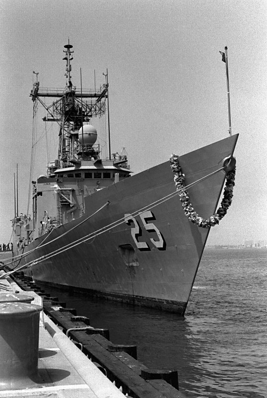 108k | 24 May 1991: San Diego, Cal. - A garland decorates the bow of Copeland as it lies tied up shortly after its return from deployment. (U.S. Navy photo DVID #DN-SN-91-11570 by PH2 Norquist, from the DVIC) | ||