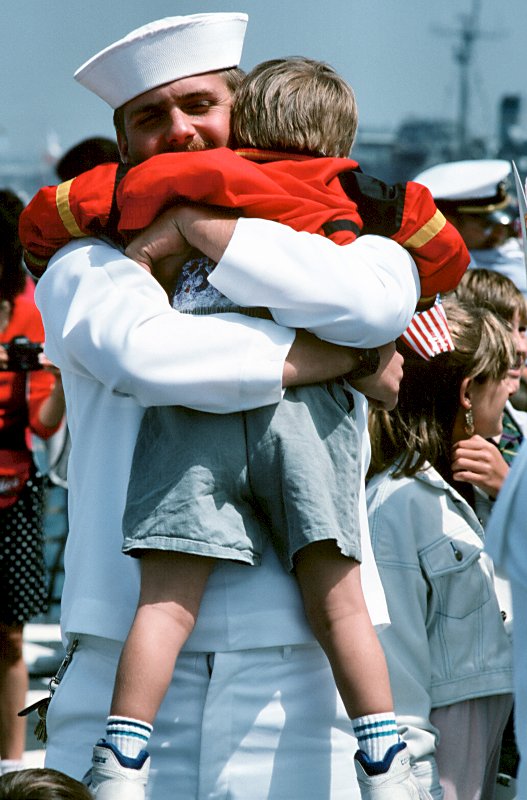 89k | 24 May 1991: San Diego, Cal. - Electronics Technician 2nd Class Craig Owens is reunited with one of his sons aboard Copeland. Copeland has