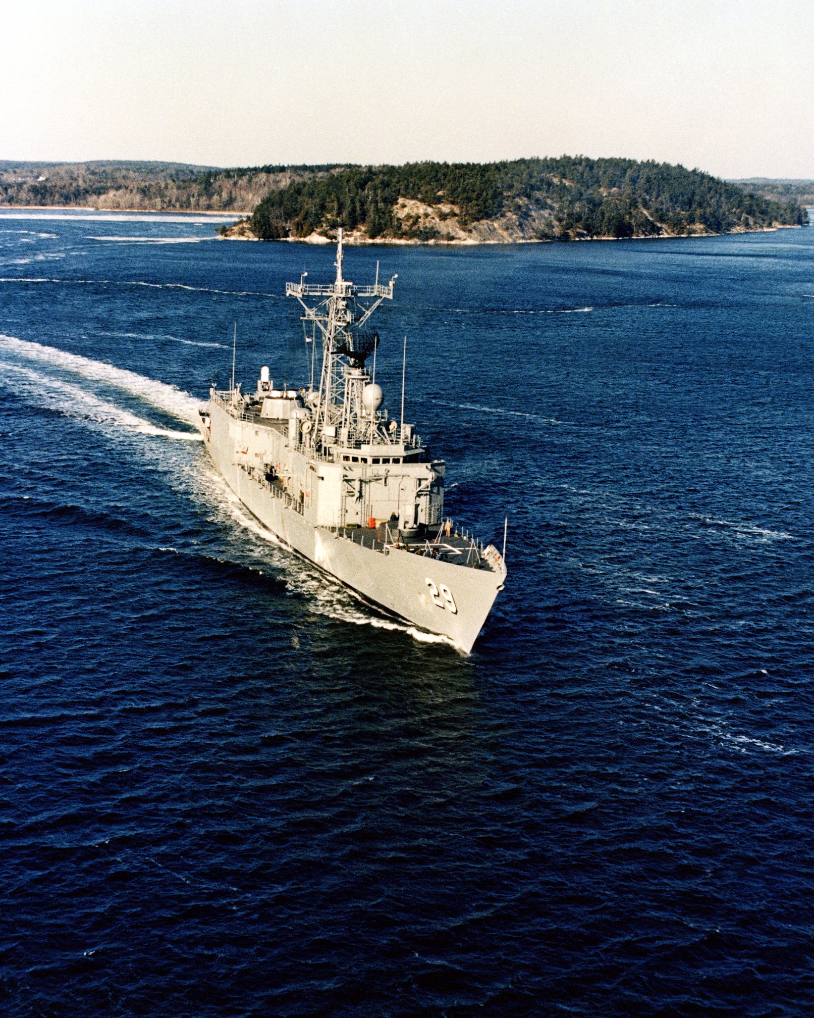1032k | 12 January 1982: Bath, Me. - An aerial starboard bow view of the Oliver Hazard Perry class guided missile frigate USS Stephen W. Groves (FFG 29)