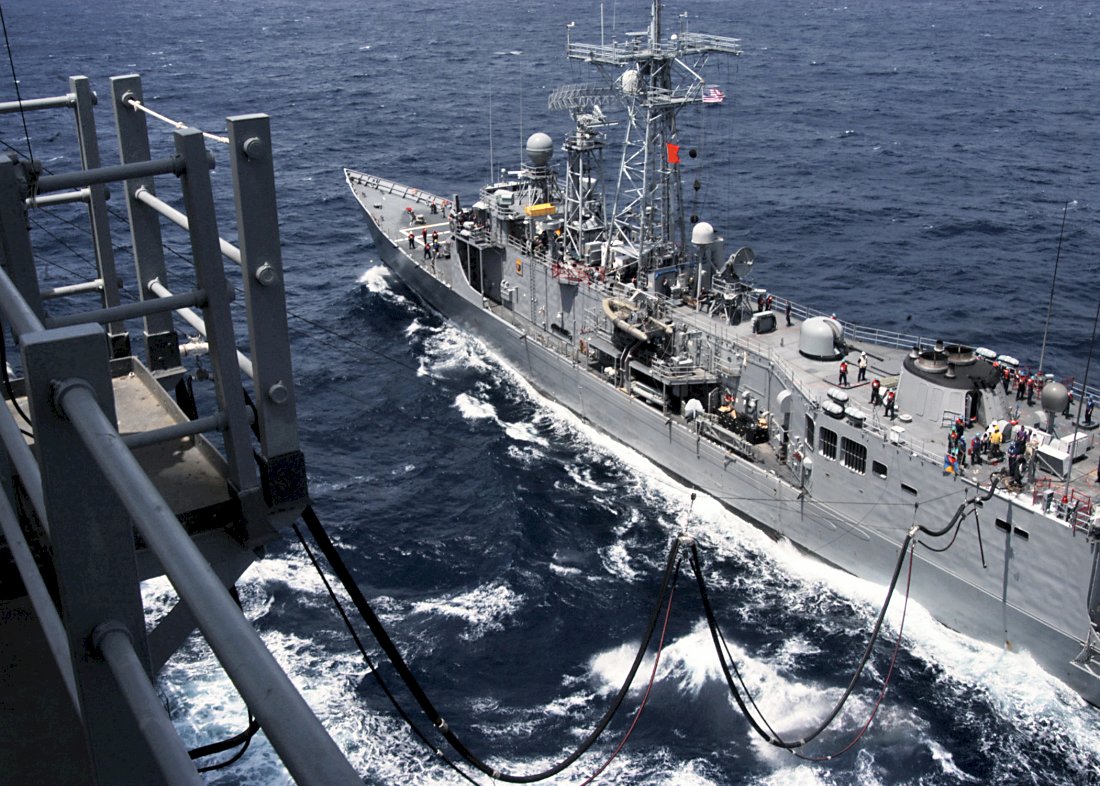 Jarrett during an underway replenishment in the Indian Ocean. Jarrett was the first ship ever to receive fuel from Peleliu since it was fitted