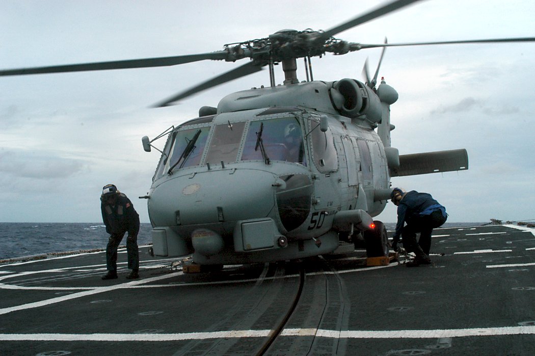 120k | 13 June 2008: Gulf of Thailand - Sailors tie down a helicopter during rough seas aboard the frigate USS Jarrett (FFG 33). Jarrett is one of