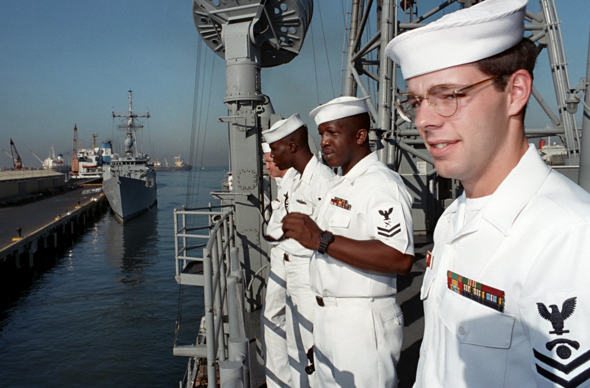 159k | 01 April 1995: Manila, R.P. - Sailors man the rail of the guided missile frigate Vandegrift
