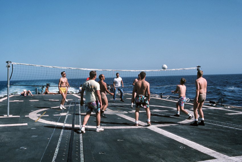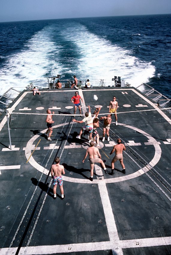 92k | 15 March 1988: the Persian Gulf - Crewmen play volleyball on the stern of Simpson while on patrol in the Persian Gulf. (U.S. Navy photo DVID #DN-ST-89-02595 by PH2 Alexander C. Hicks, Jr. from the DVIC) |