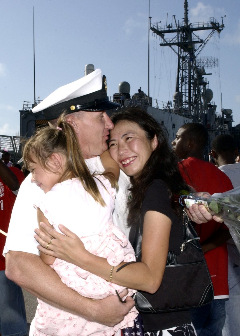 152k | 04 May 2006: Mayport, Fla. - Aviation Electronics Technician Riddle hugs his wife and daughter after returning from deployment aboard guided missile frigate