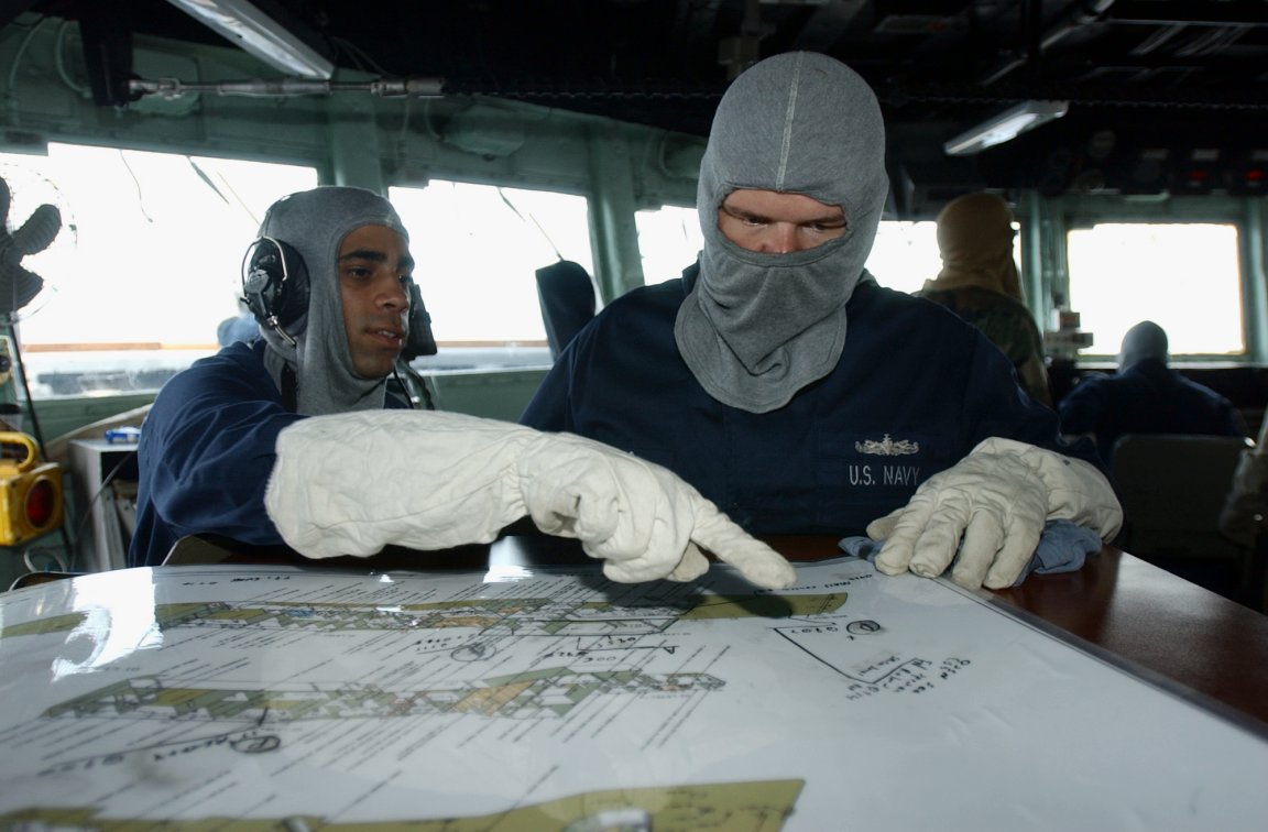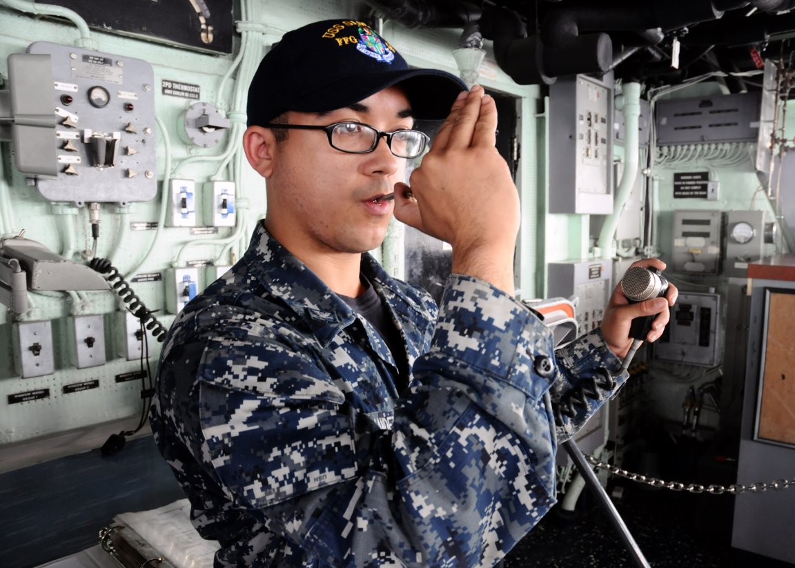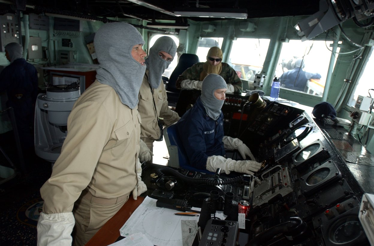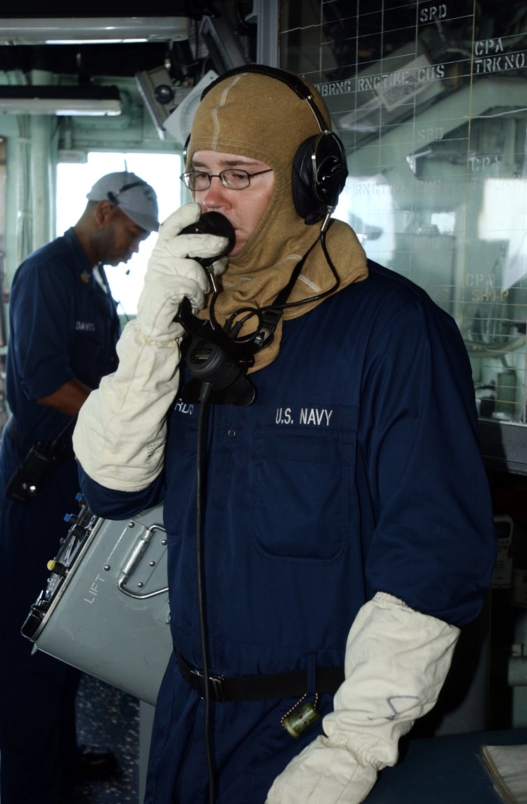 on the bridge of the guided-missile frigate Simpson during a visit, board, search and seizure training session. (U.S. Navy photo #120202-N-IZ292-079 by MC2 Felicito Rustique from the Navy Newstand) | ||
