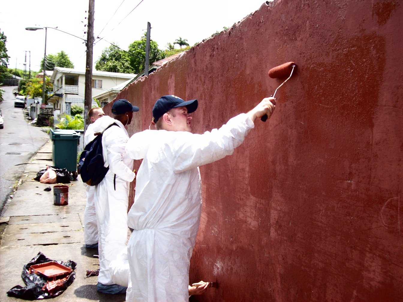 Class Steven Davis, and Ens. Chris Thompson, assigned to the frigate Simpson, paint the wall outside of St. Lucia's Gordon & Walcott Memorial Methodist School as a part