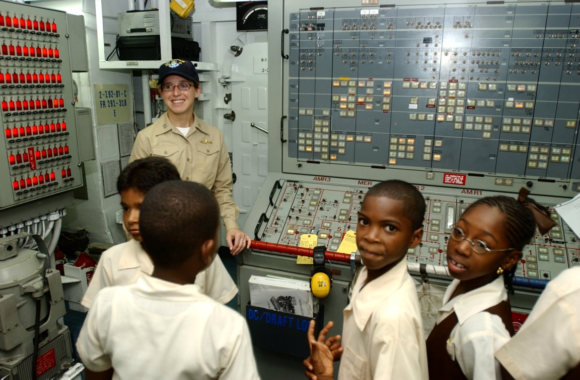 179k | 03 July 2008: Castries, St. Lucia - Lt. Jennifer Free, chief engineer aboard the frigate Simpson conducts a tour for students from Gordon & Walcott
