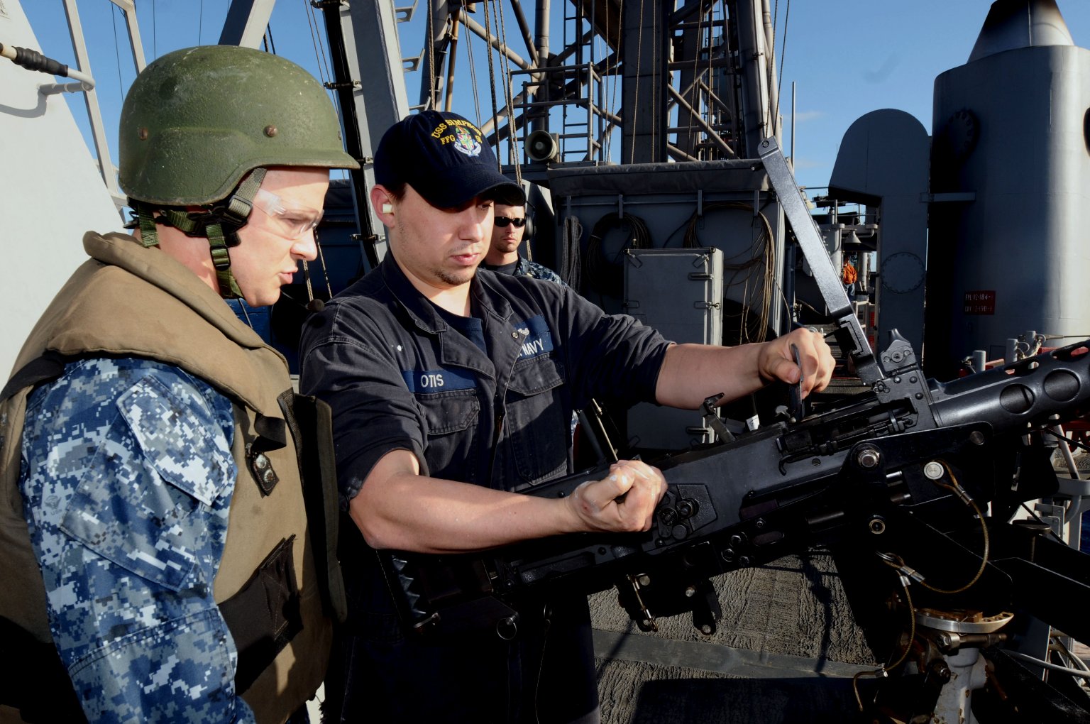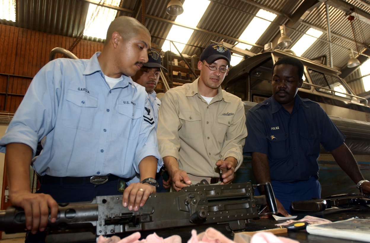 175k | 03 July 2008: Castries, St. Lucia - Chief Gunner's Mate Keith Novak reviews maintenance procedures for the .50 caliber machine gun with Gunner's Mate 2nd