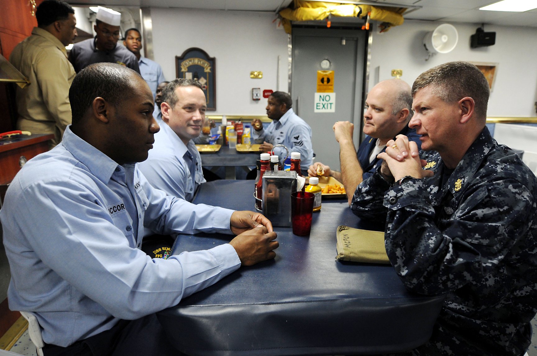 319k | 18 February 2009: Mayport, Fla. - Master Chief Petty Officer of the Navy (MCPON) Rick West speaks with sailors on the mess decks aboard the guided-missile