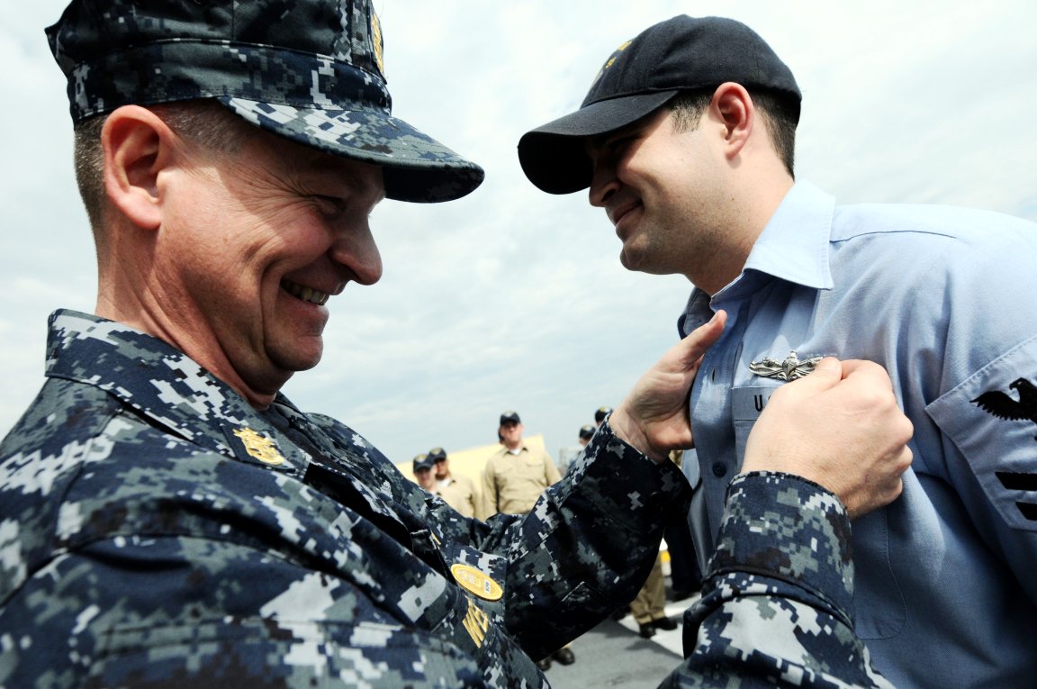 his Enlisted Surface Warfare Specialist pin aboard Simpson. (U.S. Navy photo #090218-N-9818V-297 by MC1 Jennifer A. Villalovos from the Navy Newstand) | ||
