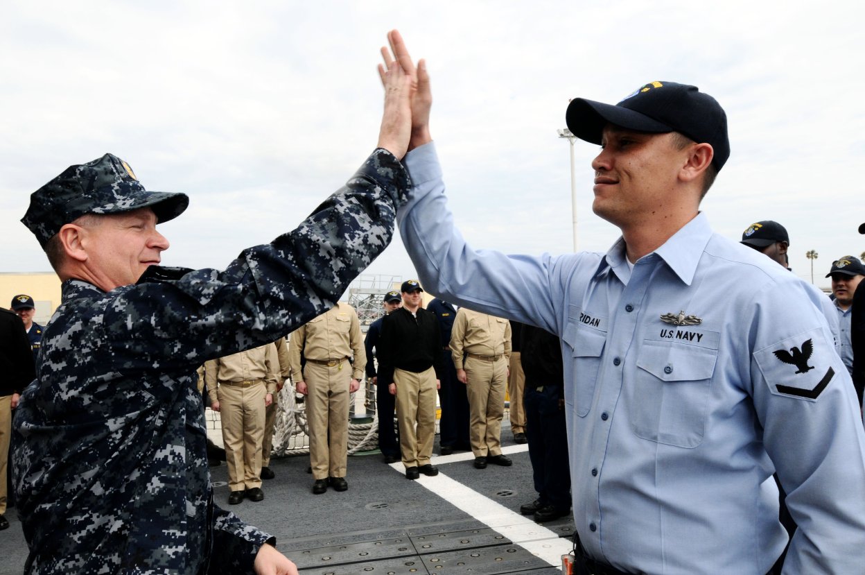 169k | 18 February 2009: Mayport, Fla. - Master Chief Petty Officer of the Navy Rick West congratulates Machinery Repairman 3rd Class Joshua Sheridan for earning