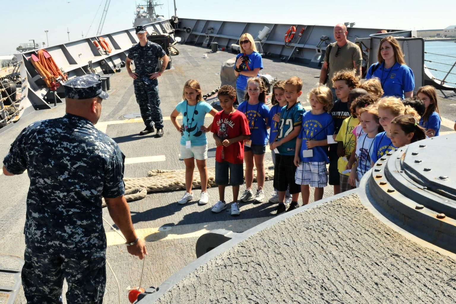 395k | 04 October 2010: Mayport, Fla. - Sailors aboard the guided-missile frigate Simpson explain about mooring lines and the ship's anchor to 2nd grade