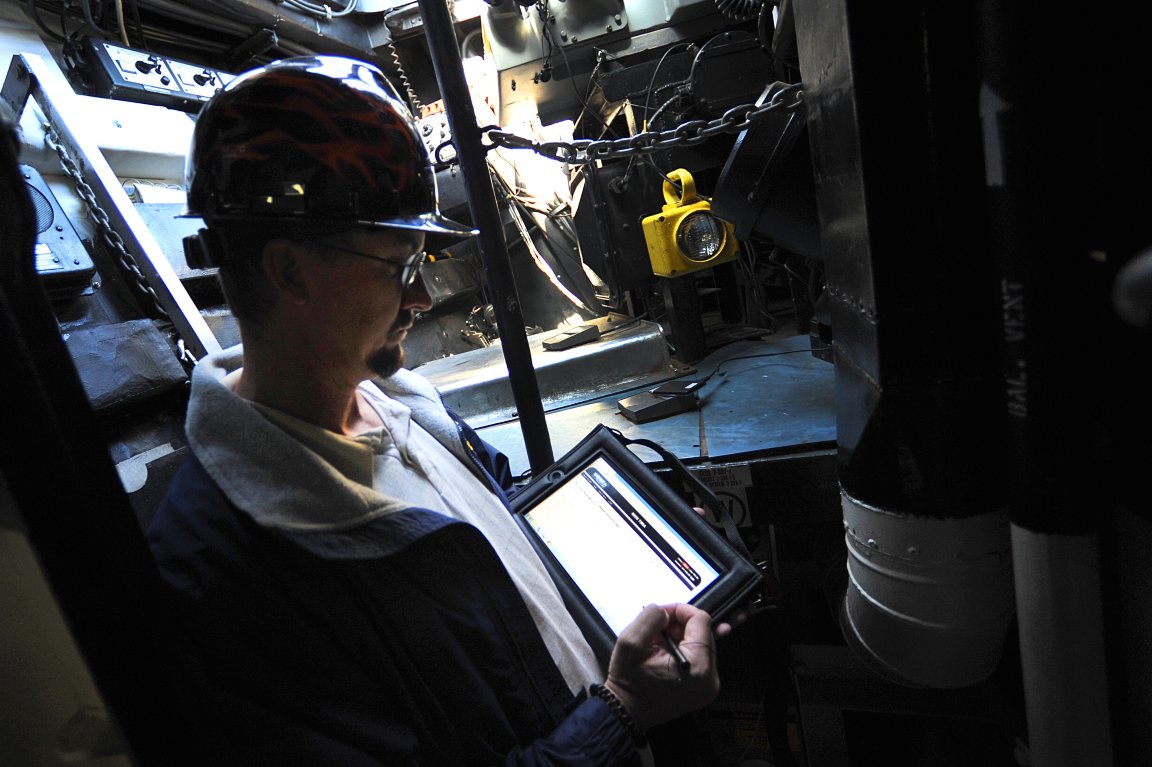 140k | 20 October 2011: Mayport, Fla. - Todd Crawford, assessment director at Southeast Regional Maintenance Center, utilizes the REDI system tablet to conduct a
