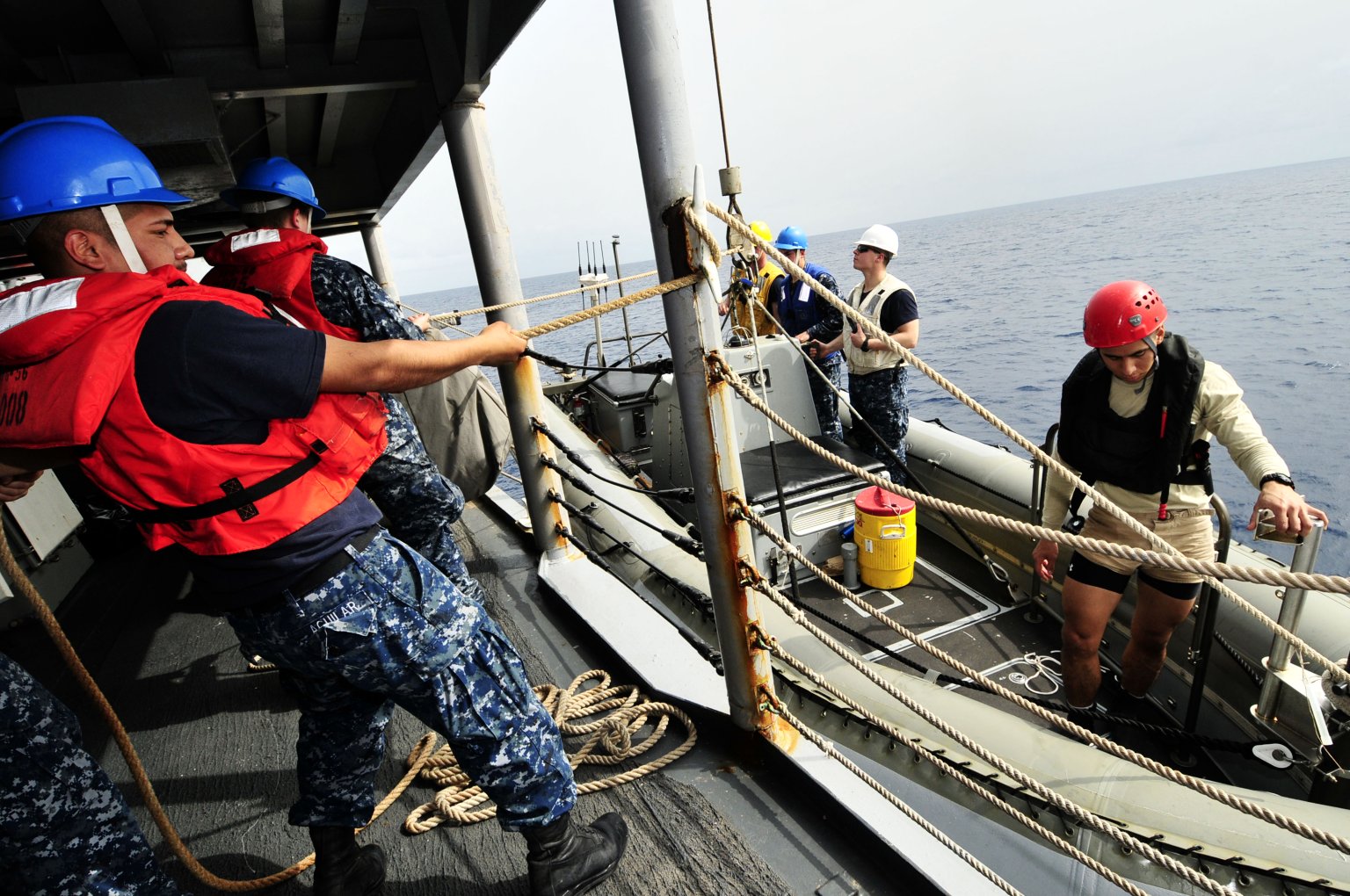 338k | 11 February 2012: the Atlantic Ocean - Seaman James Aguilar steadies a rigid-hull inflatable boat during small boat operations aboard Simpson. (U.S. Navy photo #120211-N-IZ292-077 by MC2 Felicito Rustique from the Navy Newstand) | ||