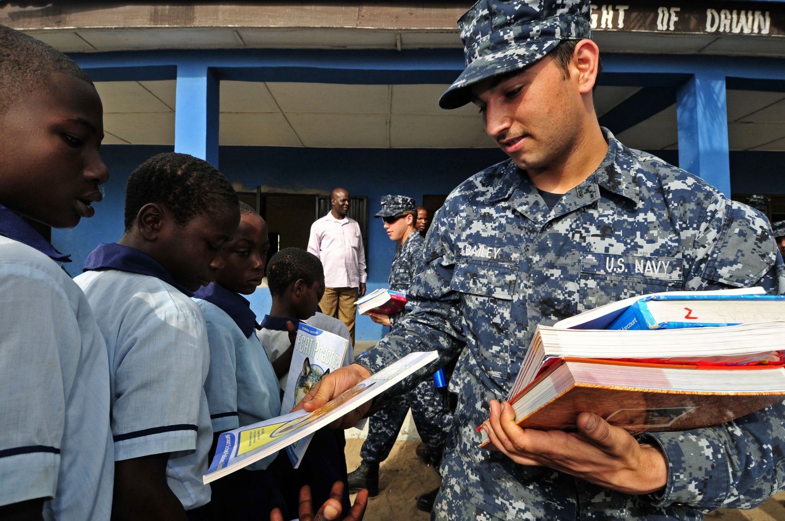 books for school children at the Tomaro Junior Secondary School during a community project in support of Africa Partnership Station 2012. (U.S. Navy photo #120216-N-IZ292-005 by MC2 Felicito Rustique from the Navy Newstand) | ||