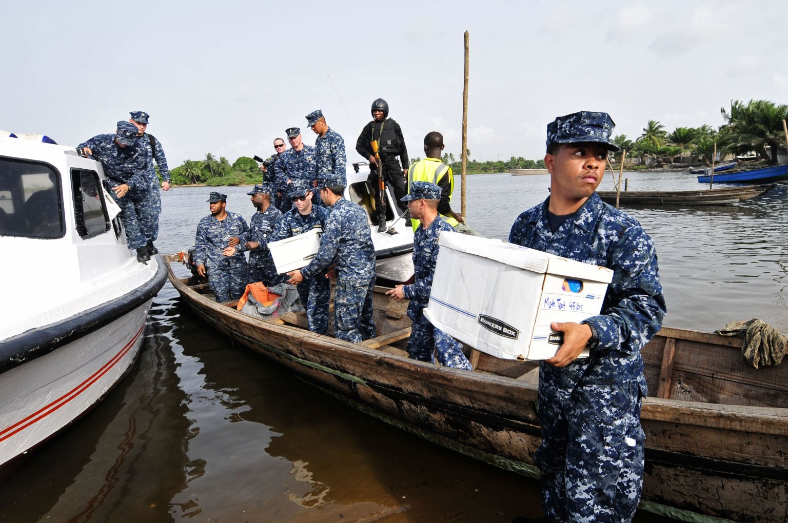 313k | 16 February 2012: Lagos, Nigeria - Ship's Serviceman Seaman Recruit Bernard Ford, right, assigned to the guided-missile frigate Simpson, helps offload