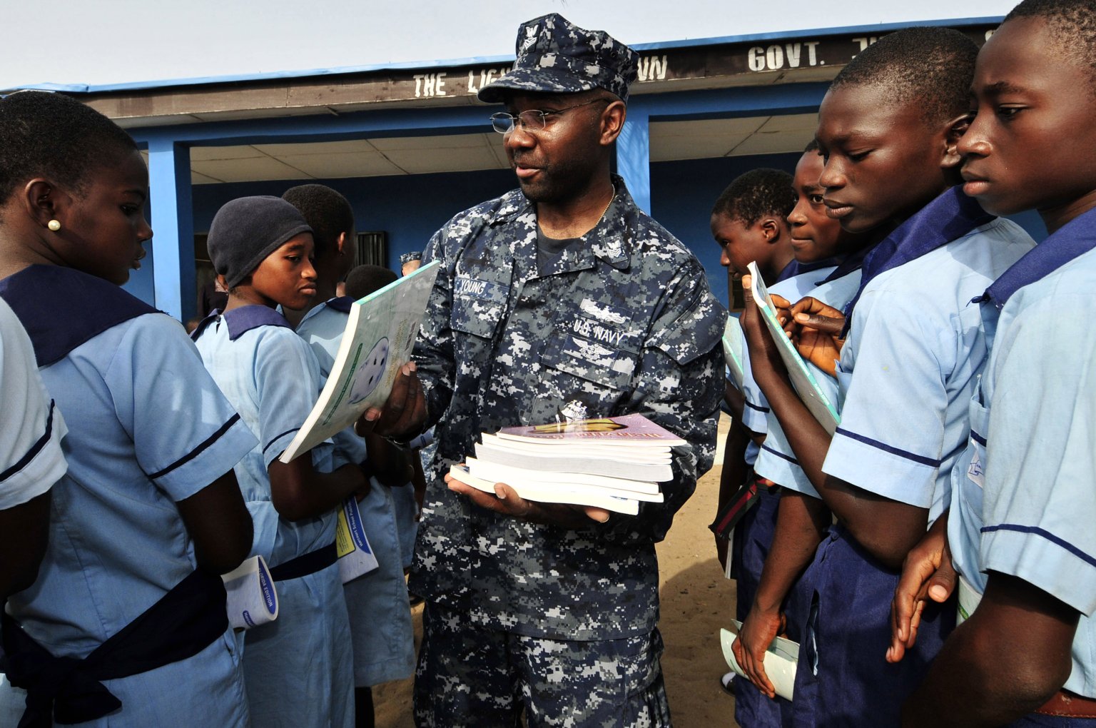 to school children from the Tomaro Junior Secondary School during a community project in support of Africa Partnership Station 2012. (U.S. Navy photo #120216-N-IZ292-053 by MC2 Felicito Rustique from the Navy Newstand) | ||