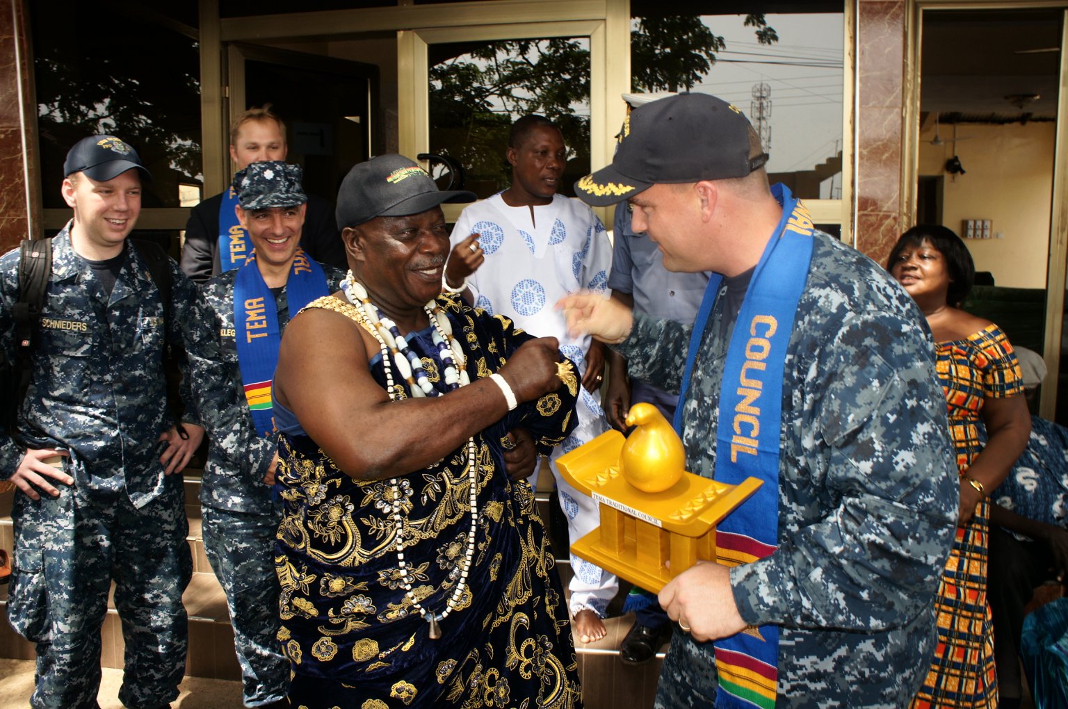 297k | 20 February 2012: Tema, Ghana - Commander Leonard Milliken, commanding officer of Simpson, snaps his fingers as part of a local traditional handshake from