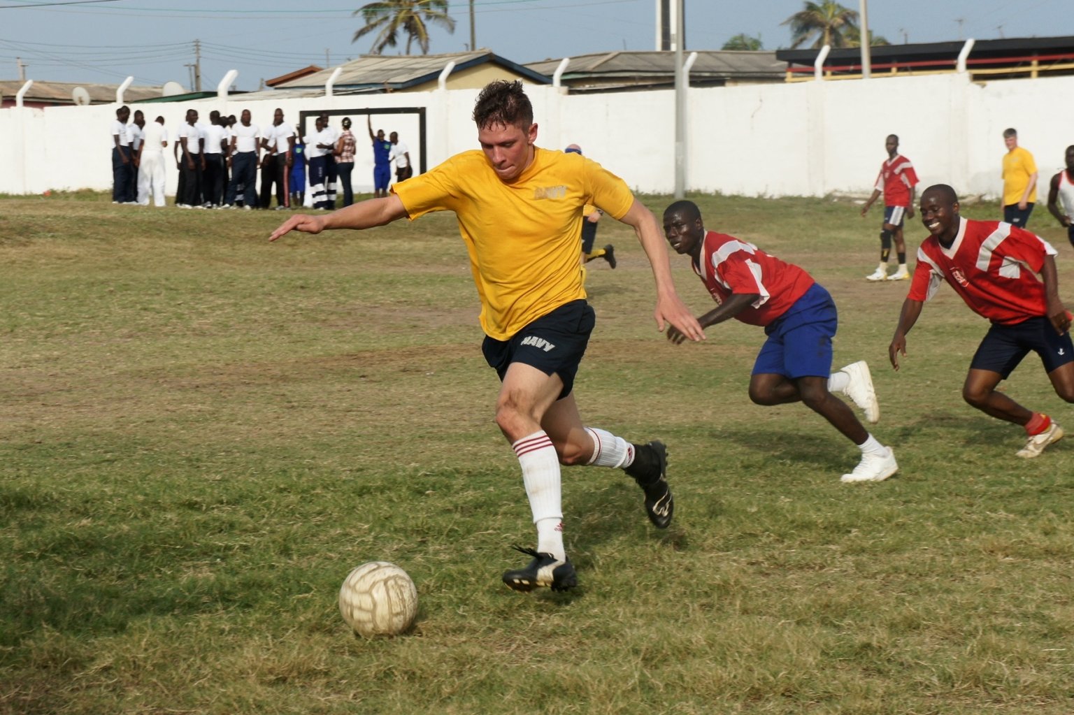 380k | 19 February 2012: Tema, Ghana - Yeoman 2nd Class Henry Callis, a member of the ship's soccer team aboard Simpson, breaks the ball away from his Ghanaian navy