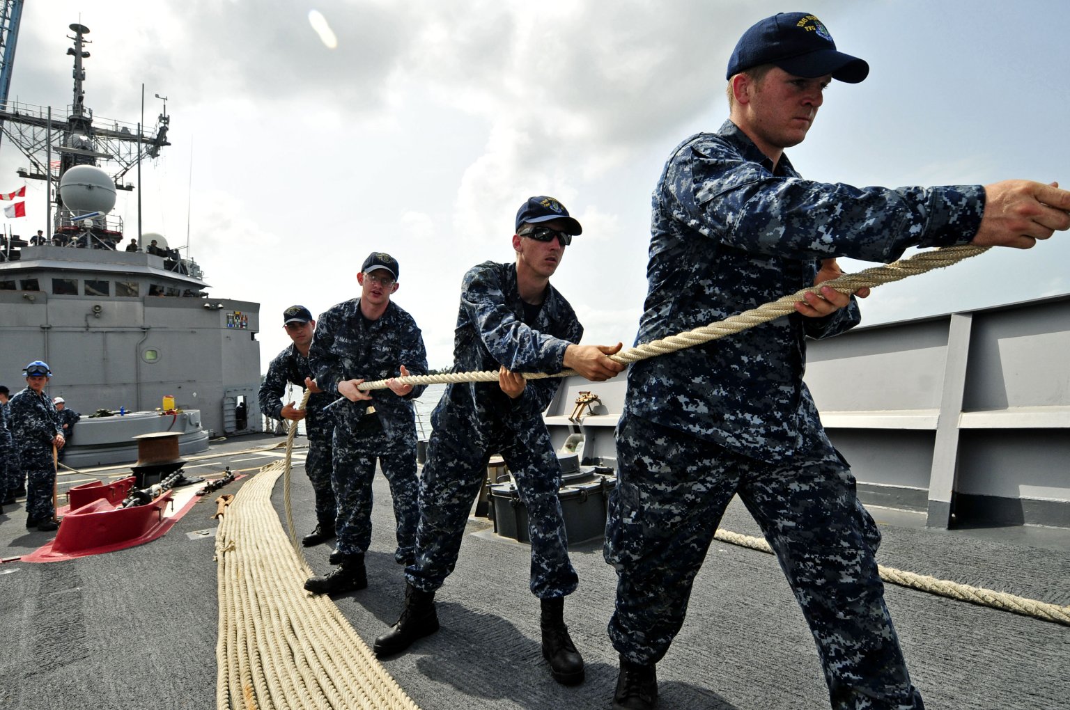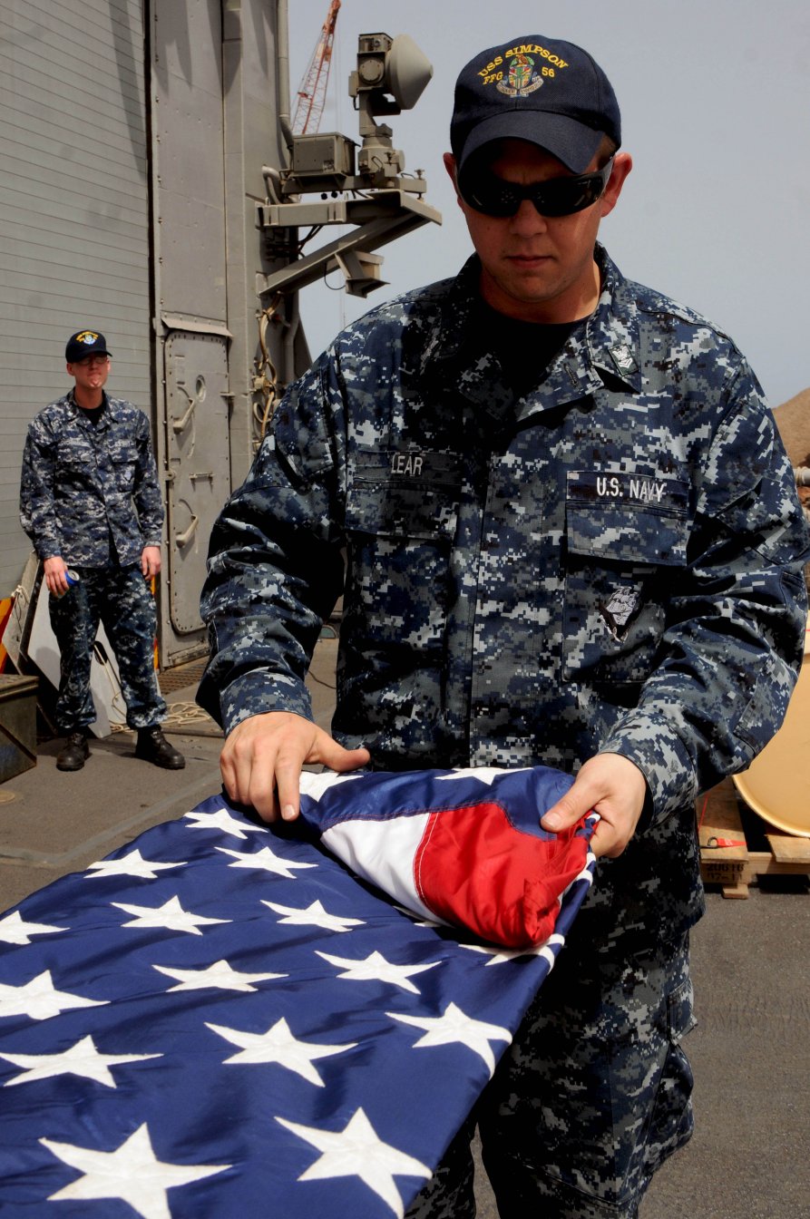 255k | 15 April 2012: Praia, Cape Verde - Sonar Technician (Surface) 2nd Class Kyle Lear folds the ships ensign on the flight deck of Simpson as the ship departs Praia, Cape Verde. (U.S. Navy photo by MCSN Brian T. Glunt from the United States Africa Command) | ||